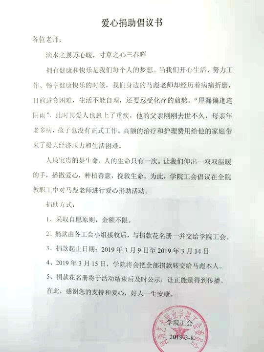 在院党委的倡议下,学院工会于2019年3月8日,开展了对马彪同志爱心捐助活动,活动中,院领导带头,广大教职工积极行动,部分退休教师、外聘教师也参与其中。