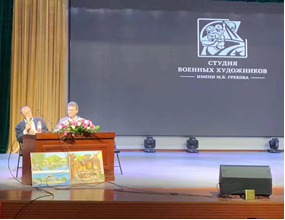 海军与战争绘画艺术家负责人斯皮里多诺夫重点介绍了他的多幅历史战争题材作品。他认为,战争题材可以弥补历史的空白,能够让历史更加生动,同时,他强调传统艺术的重要性,用传统艺术的手法,充分展示俄罗斯民族的特征及精神。他认为,相比较服务于精英阶层的欧洲艺术,俄罗斯和中国的艺术在属于人民大众这一立脚点上是共通的。