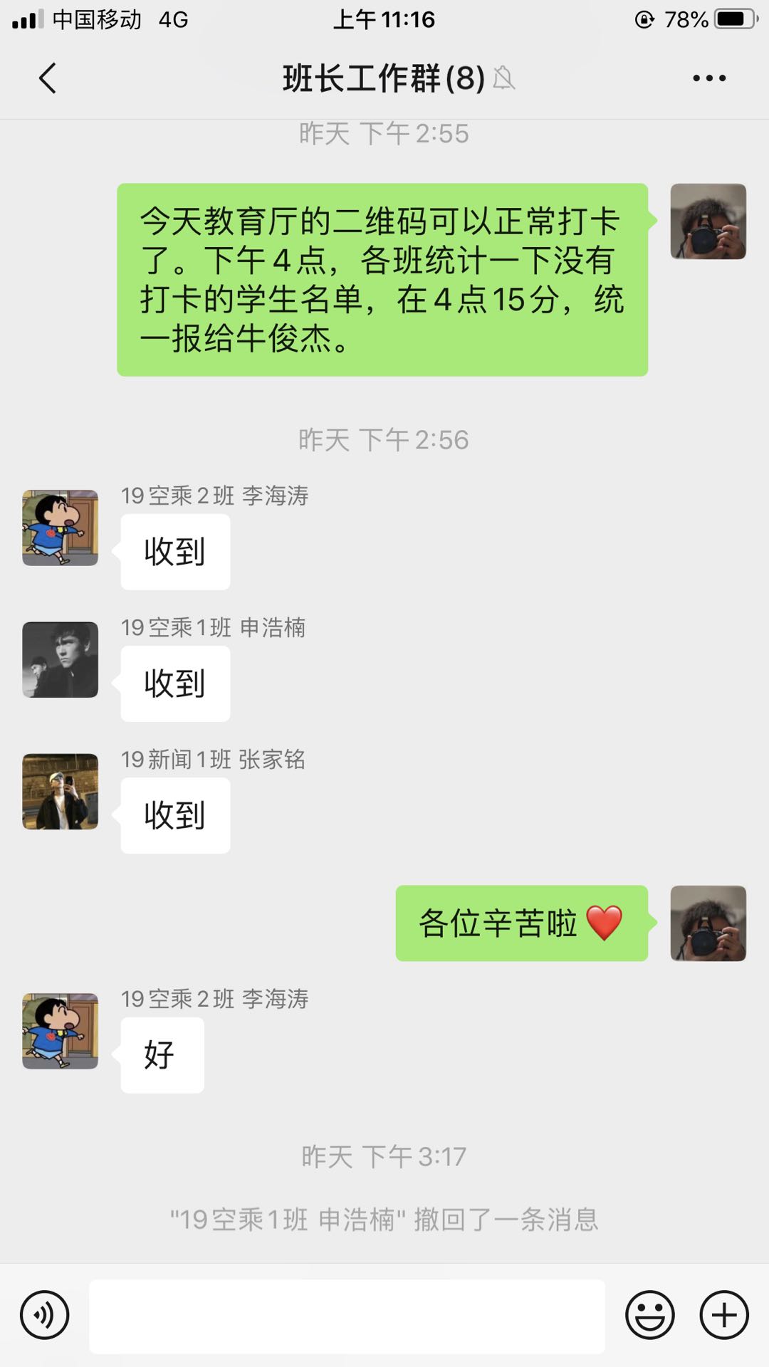 辅导员穆延柯老师,担任毕业班18播音专业的辅导员工作,在身体患病的情况下,以最短时间联系到了18播音身在天南海北的200名学生。