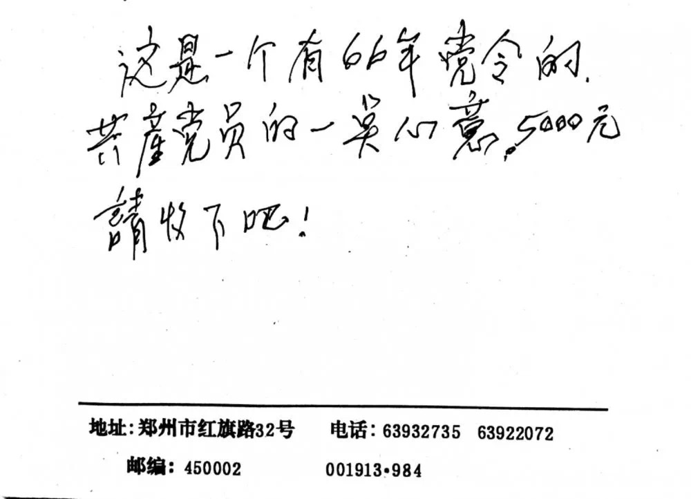 顾群老师那张纸条上写的是: 这是一个有66年党龄的共产党员的一点心意,5000元,请收下吧!