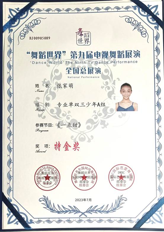 2023年7月21日,第九届“舞蹈世界”北京全国舞蹈总决赛中,我校舞蹈学院2022级学生张家萌参赛的舞蹈剧目《一点甜》获得“特金奖”第一名。