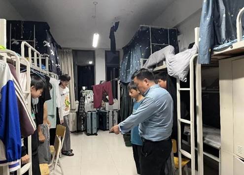 中专教学部党总支书记王松林深入课堂,查看学生学习情况,对学生就寝情况、安全用电、学生卫生、宿舍设施等情况进行实地检查。