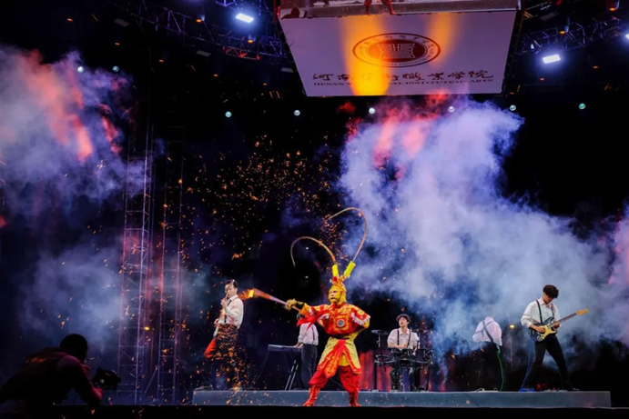 随着《云宫迅音》的音乐响起,在场学生们一片沸腾。河南大学河南戏剧艺术学院2024级新生王帅奇扮演齐天大圣孙悟空,挥舞着金箍棒炫酷登场,闪耀的金光划破夜空,赢得一片欢呼声喝彩。