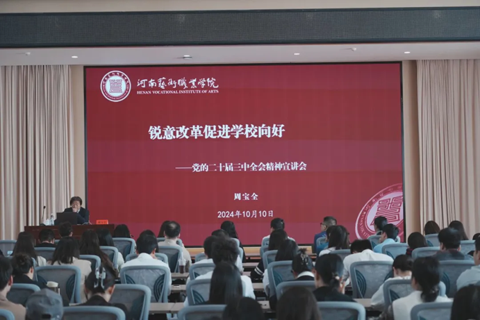 2024年10月10日下午,我校在至真堂举办学习贯彻党的二十届三中全会精神宣讲会,校长周宝全作宣讲报告。各二级学院副书记、全体思政课教师、辅导员及学生代表参加。