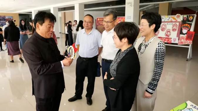 观展过程中,王利蕊对作品的设计理念、呈现形式和创作特色进行详细地介绍。她谈到,本次展览围绕课程第十章《建设社会主义文化强国》,包含“纸鸢裁春•灯火相传”“非遗薪火·守艺中国”“墨脉千年·画说时代”等系列主题,让学生根据专题知识,运用手工作品、微视频、绘画等具体形式进行创作,使文化认同深深扎根于学生心中。