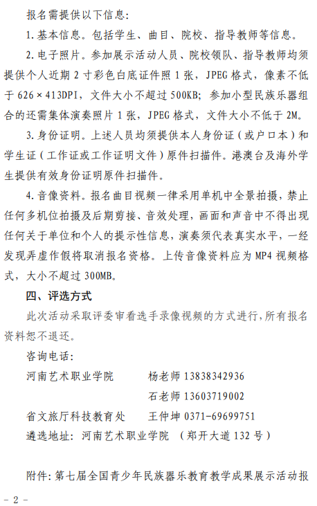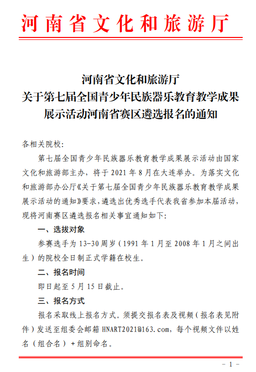 河南省文化和旅游厅关于第七届全国青少年民族器乐教育教学成果展示活动河南省赛区遴选报名的通知